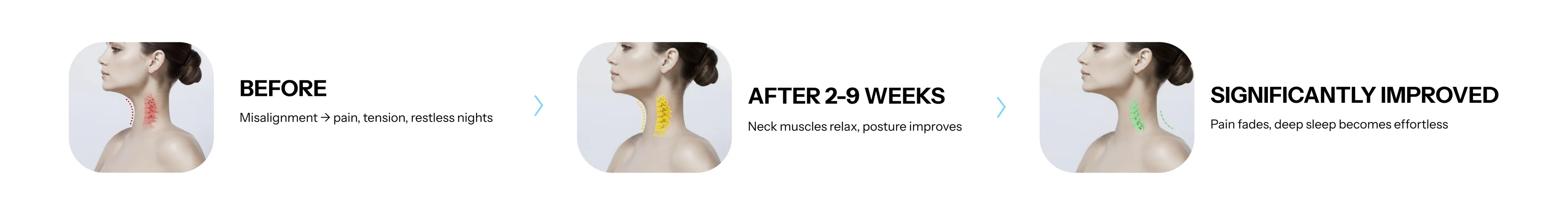 Most users feel noticeable relief within the first few nights, with deeper improvements in alignment and sleep quality over 4–6 weeks of consistent use.
